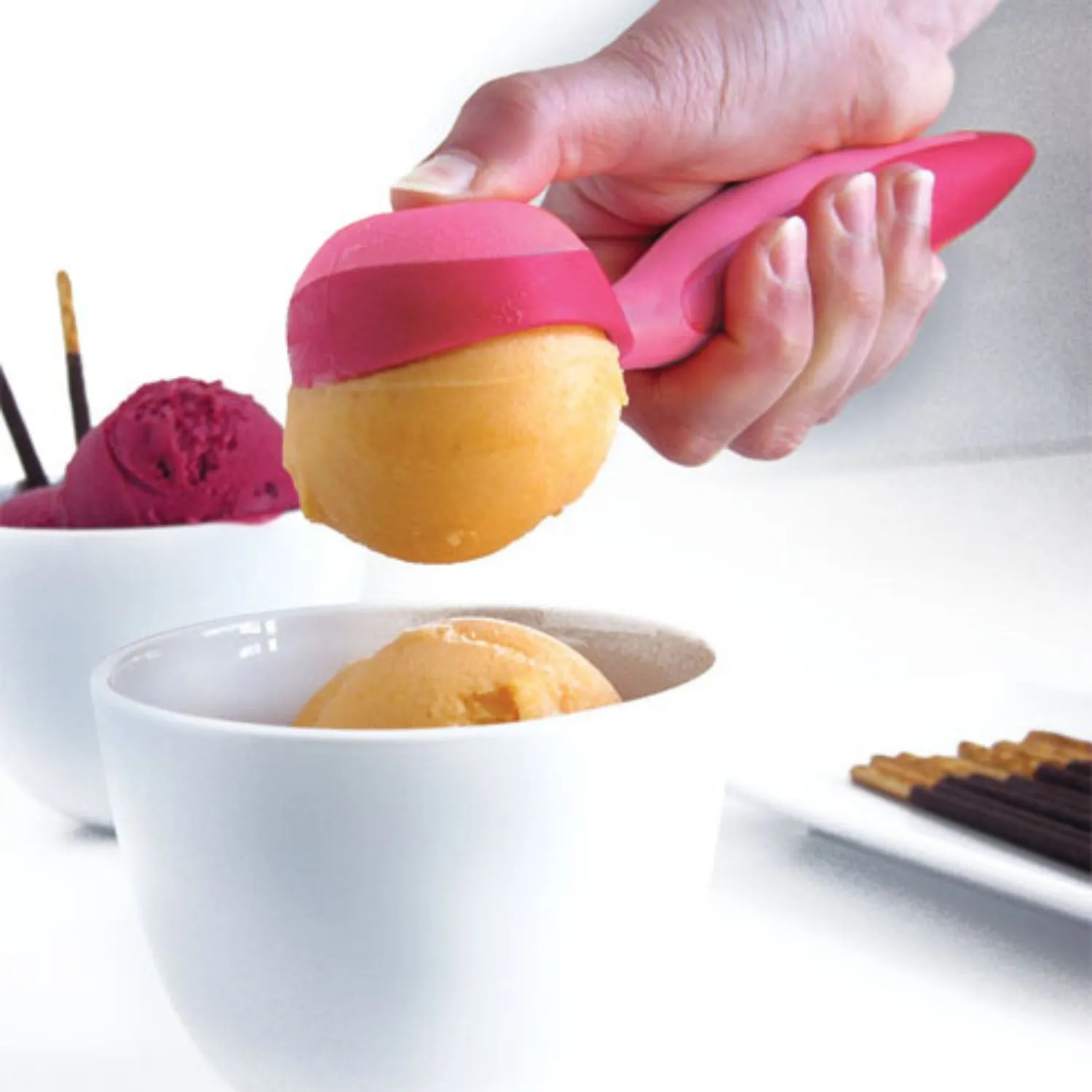 La cuillère à glace Mastrad permet un démoulage facile des boules de glace, en appuyant tout simplement sur le fond souple.